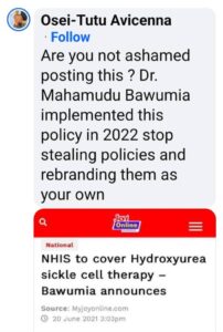 “Are you not ashamed of posting this? Dr Mahamudu Bawumia implemented this policy in 2022. Stop stealing policies and rebranding them as your own,” another added, sharing a MyJoyOnline report from August 2022.