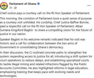 Welcoming the Chief Justice, Speaker Bagbin described the visit as historic, stressing the importance of collaboration between the Judiciary and the Legislature in consolidating Ghana’s democratic governance and strengthening state institutions.