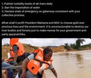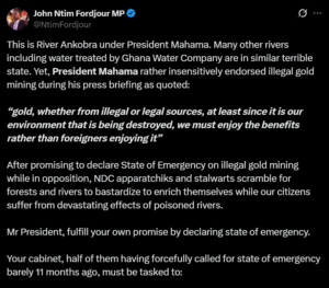 In a post on X, the Assin South MP shared an image of the heavily polluted River Ankobra, blaming the devastation on the President’s insensitivity to the country’s environmental crisis. According to Ntim Fordjour, President Mahama’s assertion that “gold, whether from illegal or legal sources… we must enjoy the benefits rather than foreigners enjoying it” was reckless and amounted to legitimising environmental destruction.