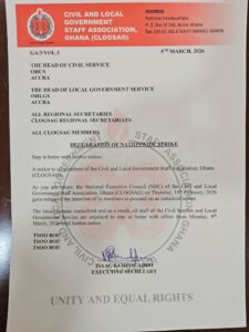 The notice, addressed to the Head of Civil Service, the Head of the Local Government Service, regional secretaries of CLOGSAG, and all members of the association, stated that the decision was taken after the union had earlier served notice of its intention to embark on an industrial action.