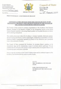 “The Council of State extends its warmest congratulations to His Excellency John Dramani Mahama… on his distinguished success at the United Nations General Assembly in advancing Ghana’s position on the global discourse on slavery and its enduring consequences,” the statement said.