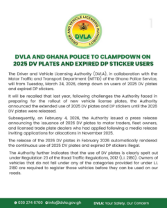 The Driver and Vehicle Licensing Authority (DVLA), in collaboration with the Motor Traffic and Transport Department (MTTD) of the Ghana Police Service, has announced a nationwide enforcement exercise targeting vehicles using 2025 DV plates and expired DP stickers.