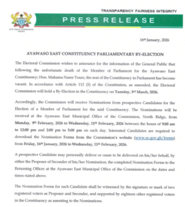 In a press release dated January 16, 2026, the Commission outlined the process and schedule for prospective candidates. According to the release signed by Samuel Tettey, Deputy Chairman for Operations, nominations will be received at the Ayawaso East Municipal Office of the EC in North Ridge from Monday, February 9, to Wednesday, February 11, 2026, between 9:00 a.m. and 12:00 p.m., and from 2:00 p.m. to 5:00 p.m. daily.