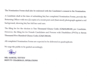 Each candidate must also submit two recent bust-sized photographs against a red background and pay a non-refundable filing fee. The fee is set at GH¢10,000 for general candidates, with a reduced rate of GH¢7,500 for female candidates and persons with disabilities (PWDs).