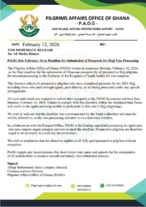The Pilgrims Affairs Office of Ghana (PAOG) has announced Monday, February 16, 2026, as the final date for all prospective Hajj pilgrims to submit their Ghanaian passports for visa processing to the Embassy of the Kingdom of Saudi Arabia.