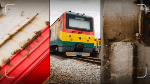 Today, Kojokrom station is a ghost of its grand opening. The metal benches are rusted, the silver gates dull, and weeds creep over the roof. Cobwebs lace the waiting areas, and the once-luxurious coaches stand immobile, their bodies eaten by rust in shades of brown and orange.