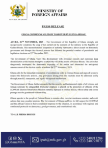 The Government of Ghana has issued a strong condemnation of the unfolding military coup in Guinea-Bissau, describing the action as a “direct assault on democracy” and a grave attempt to overturn the will of the people.