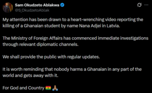 “My attention has been drawn to a heart-wrenching video reporting the killing of a Ghanaian student by the name Nana Adjei in Latvia,” he wrote. “The Ministry of Foreign Affairs has commenced immediate investigations through relevant diplomatic channels. We shall provide the public with regular updates.”