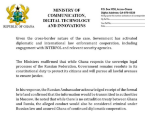 Speaking at the briefing, Minister for Communication Sam Nartey George stated that the government’s engagement with the Russian Embassy in Ghana confirmed the individual’s nationality.