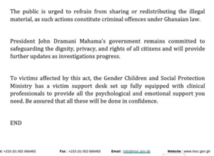 The government reiterated its commitment to protecting the rights and dignity of Ghanaian women, warning that individuals who distribute intimate content without consent will face full legal consequences.