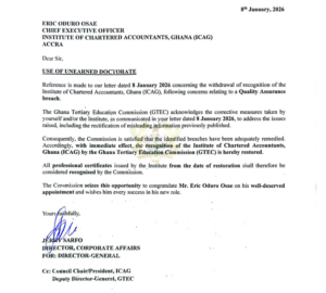 “Consequently, the Commission is satisfied that the identified breaches have been adequately remedied,” the letter stated. “Accordingly, with immediate effect, the recognition of the Institute of Chartered Accountants, Ghana (ICAG), by the Ghana Tertiary Education Commission (GTEC) is hereby restored.”