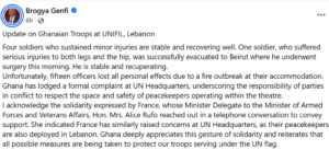 Providing an update on the condition of Ghanaian troops serving under the United Nations Interim Force in Lebanon (UNIFIL), the Deputy Minister indicated that the injured soldier suffered serious wounds to both legs and the hip but is now stable and recuperating following surgery performed on the morning of Saturday, March 7.