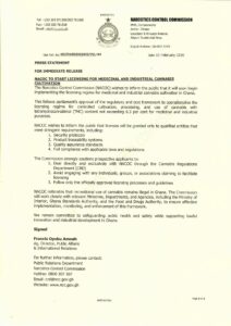 NACOC cautioned prospective applicants to engage directly and exclusively with the Commission through its Cannabis Regulations Department (CRD). It warned against dealing with individuals, groups or associations that claim to facilitate the licensing process.