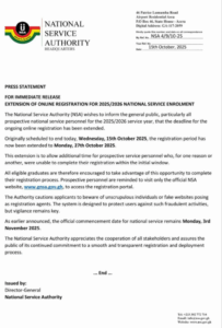The National Service Authority (NSA) has extended the deadline for the ongoing online registration for the 2025/2026 service year, giving prospective personnel additional time to complete their enrolment.