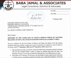 In a letter dated October 1, 2025, and signed by Fati Ali-Yallah of Baba Jamal & Associates, the legal team stressed that Mrs Fosu has no legal or customary authority to determine how the family should conduct the funeral of the celebrated musician.