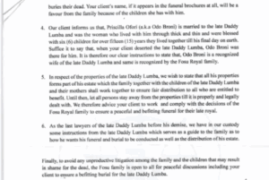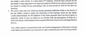 The letter alleged that Mrs Fosu abandoned Daddy Lumba about 15 years ago when he fell seriously ill, choosing not to return to Ghana to care for him. It further stated that she performed customary rites to dissolve their marriage, an act recognised under Akan tradition, thereby ending her marital ties to the musician.