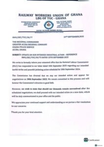 The Railway Workers Union of Ghana (RWU) has suspended its planned nationwide strike slated for Tuesday, September 30, 2025, after receiving a directive from the National Labour Commission (NLC) to return to the negotiation table.