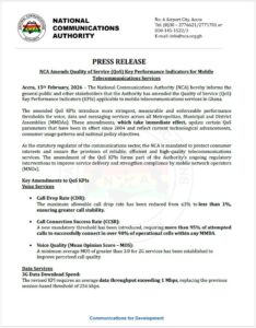 In a press release dated Sunday, February 15, 2026, the regulator announced it has amended the Quality of Service (QoS) Key Performance Indicators (KPIs) for mobile telecommunications services in Ghana, describing the new standards as “more stringent, measurable and enforceable” across all Metropolitan, Municipal and District Assemblies (MMDAs).